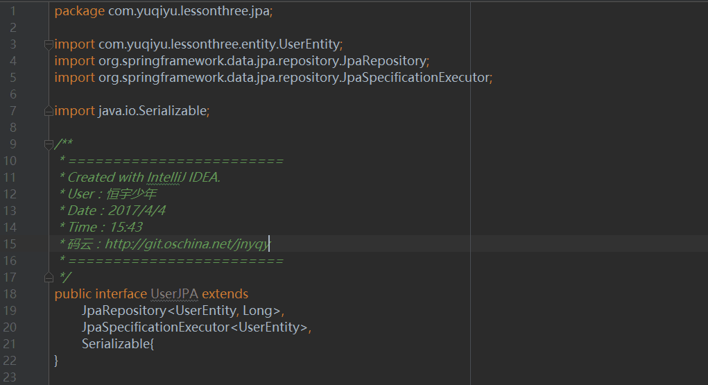 我们UserJPA继承了JpaRepository接口(SpringDataJPA提供的简单数据操作接口)、JpaSpecificationExecutor(SpringDataJPA提供的复杂查询接口)、Serializable(序列化接口)。
