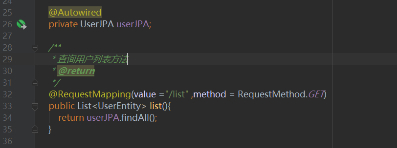 其中userJps.findAll()方法就是SpringDataJPA为我们提供的内置方法,它可以查询表内所有的数据,除了findAll还有很多有用的方法,我们后期使用一章的内容来详细介绍这个强大的家伙!
