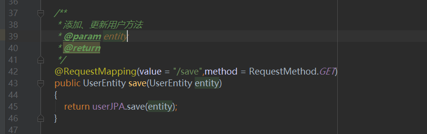 可以看到上图13中,我们只是简单的实现实体的持久化操作,userJPA.save方法可以执行添加也可以执行更新,如果需要执行持久化的实体存在主键值则更新数据,如果不存在则添加数据。