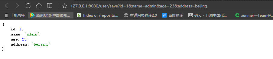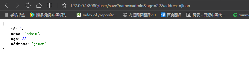 我们现在添加一条用户信息到数据库,请求地址:http://127.0.0.1:8080/user/save?name=admin&age=22&address=jinan,效果如下图17所示: