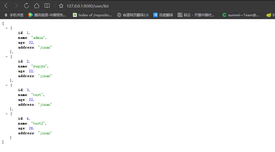 多插入几条数据方便我们下一步操作,插入完成后我们再次访问用户列表请求地址,效果如下图18所示: