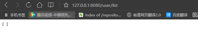 我红色标记的部分可以看到,springmvc加载了我定义的请求。那么我们尝试访问用户列表路径:127.0.0.1:8080/user/list可以看到如下图16所示,因为我们数据库中并没有数据,所以我们没有查询到结果:
