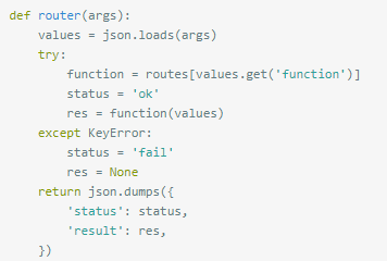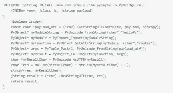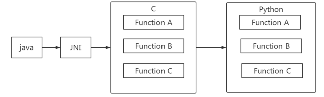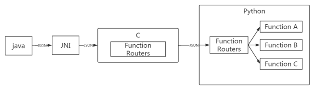 Python端增加一个路由方法,再写一个函数字典,把所有方法都加到字典里,C里调用的就是这个路由方法,java端调用的时候传入json里面包含了所需python方法,当json传入python中路由方法之后,自动匹配到相应的方法,每次添加新的方法只需要在python中添加字典已经方法,java调用时传入新的方法即可。Python路由方法:
