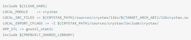 想要运行Python必须要有解释器,Android本身没有带,所以我们需要在程序中内嵌一个解释器,可是苦于找不到合适的so库,曾把P4A的python编译了一次,可是版本兼容性差,可用性不高。直到找到了Crystax NDK,它在10.3之后已经开始支持python for Android了,而且这个NDK资源包还填了几乎所有Android调用python的坑,包括第一个找不到头文件的问题,兼容的问题。在MK文件中,我们还需要加一段代码,编译crystax so库。