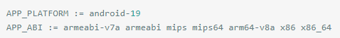 Android目前有7个常见平台需要适配,其余的都没问题,只有X86和X86_64的有问题,推测crystax NDK Windows还没完善,因为mac下是可以直接编译的,所以有关编译的东西最好用Linux和Mac,Windows下我删了一个头文件,就可以运行了,没有发现异常。具体哪个我忘了,不过运行时报错哪个就去相应的文件里把头文件依赖删了就行,就一个。然后生成7个平台的so库只需要在Application.mk中添加以下代码即可(APP_PLATFORM看个人调节):