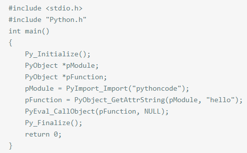 引入模块(pModule = PyImport_Import("pythoncode");)
