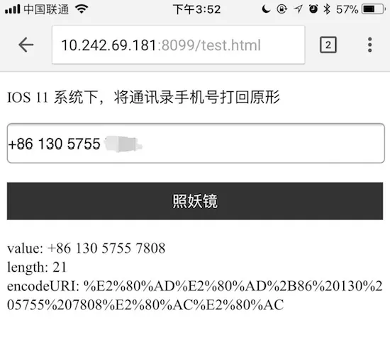 找到问题所在,我们就来一探究竟。我们准备了一个功能单一的页面,打印输出通讯录复制过来的字符串到底是个什么鬼!