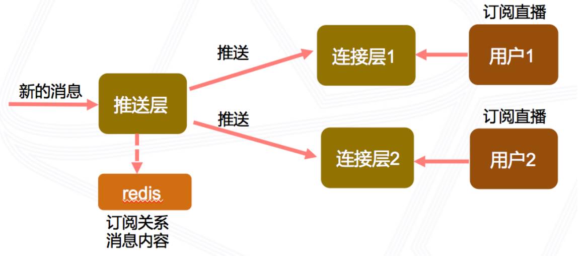 推送层存储用户与直播间的订阅关系,负责具体推送。整个连接层与推送层与直播间业务无关,不需要感知到业务的变化;