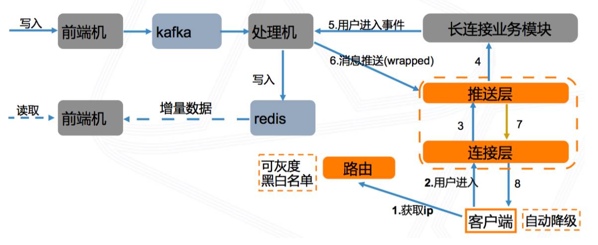 写消息流程是: 前端机 -> Kafka -> 处理机 -> Redis
