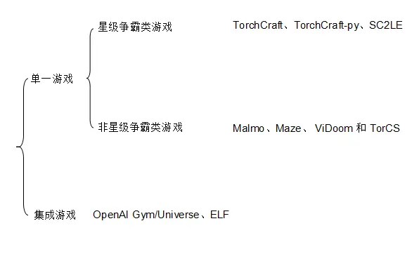 环境则是指游戏 AI 环境拥有多款游戏,比较有名的集成游戏 AI 环境有 OpenAI Gym/Universe 和 ELF。
