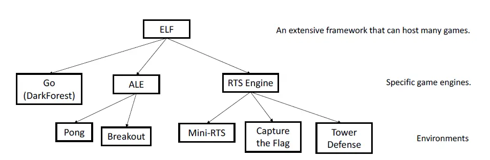 ELF 是 FaceBook 推出的游戏 AI 环境,包括围棋和 ALF(一个 Atari 游戏集)。除此之外,ELF 还实现了一个 RTS 游戏引擎,在这个引擎的基础上实现了一个夺旗游戏、一个塔防游戏和一个 mini-RTS。围棋和 ALF 是点缀,ELF 的重心是 RTS 游戏引擎上的 mini-RTS。