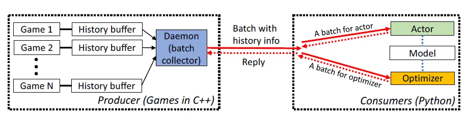 ELF 用 C++ 将许多并行的游戏线程和每个线程的历史数据封装进去,每次 Python 循环时都可以得到一批次的游戏状态。这样做有两个好处:Python 操作简便,不需要考虑分布式多线程的问题;同时 C ++ 实现的游戏引擎效率高。