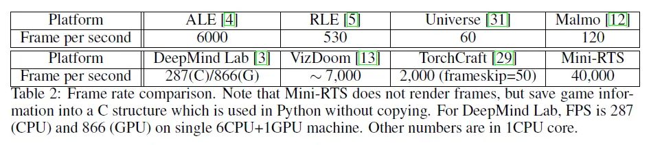 ELF 作者关心重点是 ELF 的效率,强调高速的游戏 AI 环境对提升游戏 AI 研究的迭代有重要意义。从下面对比图来看,ELF 的效率非常高,速度比其他游戏 AI 环境高了不少。ELF 为了研究去设计和实现游戏,可以控制游戏复杂,并且做很多框架和实现上的优化,从而实现极高的运行效率。