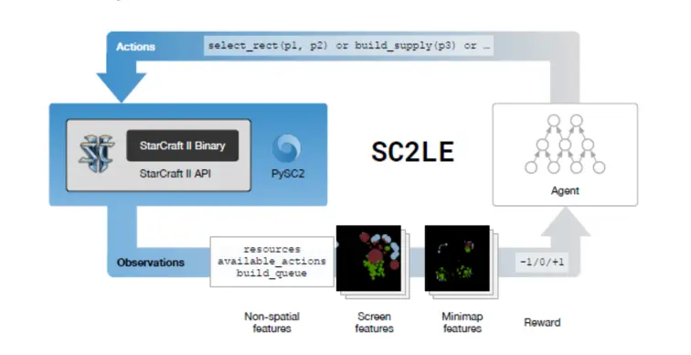 2017 年 8 月 10 号,DeepMind 联合暴雪发布了星际争霸 II 游戏 AI 环境 SC2LE, 其框架如下所示。
