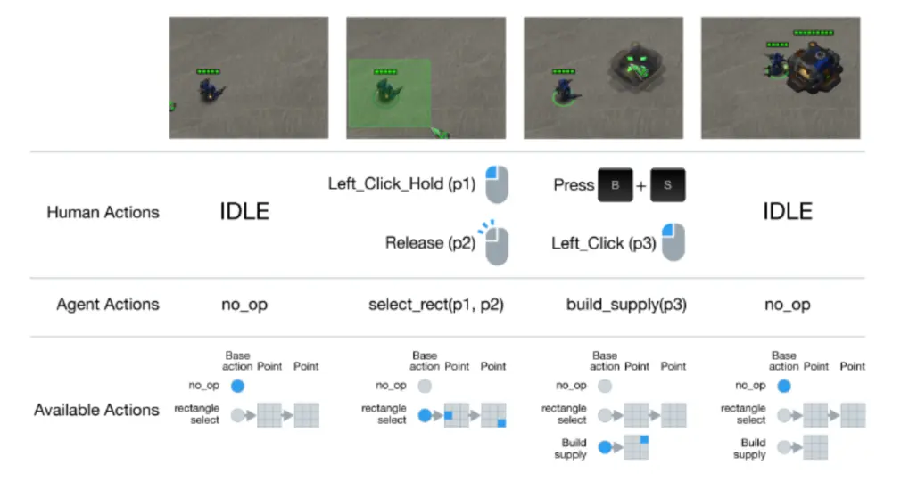 因为星际争霸的动作实在太多太杂,怎么抽象动作是 SC2LE 的一个重点。SC2LE 将星际争霸的动作空间整理成近 300 个动作函数,每个函数有相应的参数,参数一共有 13 种类型。比如在下图中,圈选一部分单位的函数为 select_rect, 两个整数参数表示选择矩阵的两个坐标点。