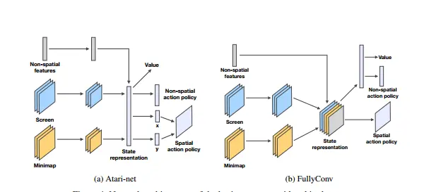为了验证 SC2LE 的效果并提供基线,SC2LE 提供了三个基于深度强化学习的基线方法。其中两个方法的网络结构分别是 Atari-net 和 FullyConv,第三个方法是 FullyConv 加 LSTM。