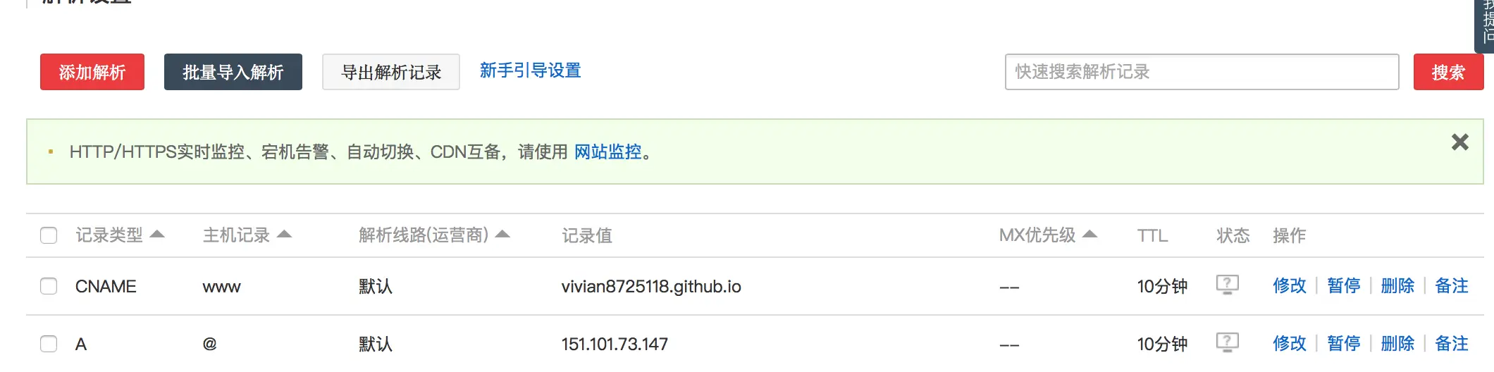 2.打开域名的解析列表,添加两条解析记录: