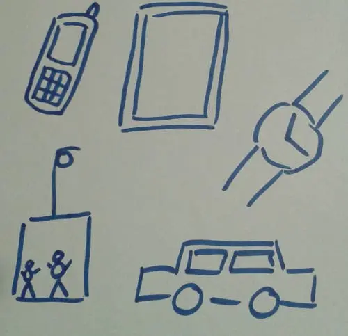 下一步是谈论电脑。所有的孩子都开始谈论起他们父母的笔记本电脑(他们反复谈论同一样事情的时候真的是非常的可爱)。等一小段时间之后,我打断了他们,告诉他们:在很多不同的东西里面都有电脑,例如智能手机和手表,还有汽车和电梯。我把提到的每个东西都画了出来,并用几个字来概括在什么情况下该用哪种电脑。我又问他们天气预报是如何实现的(一个聪明的孩子回答道:“卫星知道第二天的天气”),然后告诉他们是电脑根据数千个测量设备提供的数据计算出预测结果。