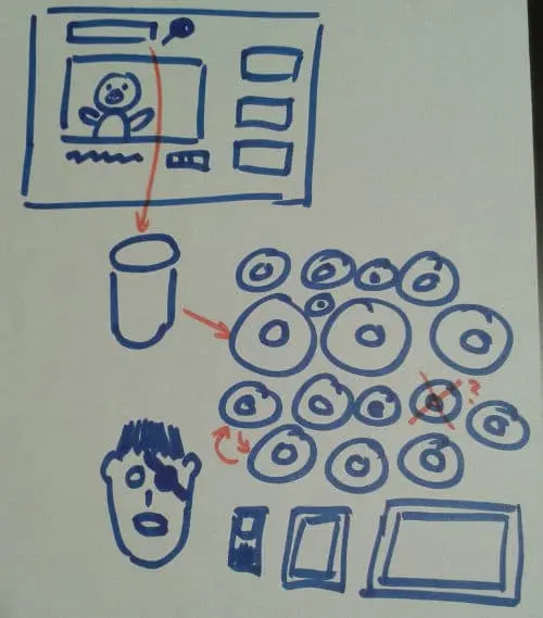 通过提问和绘图的方式让他们参与进来。原始的图纸非常大(是活动挂图),我一边讲解一边画画。这是让年幼的观众们参与进来的一个很好的方法(他们会很开心的笑话程序员稻草人,或指出小猪佩奇的样子并不是这样的,等等)。我现在手头并没有原始的图纸,当时忘了拍照了,所以我又画了一遍。