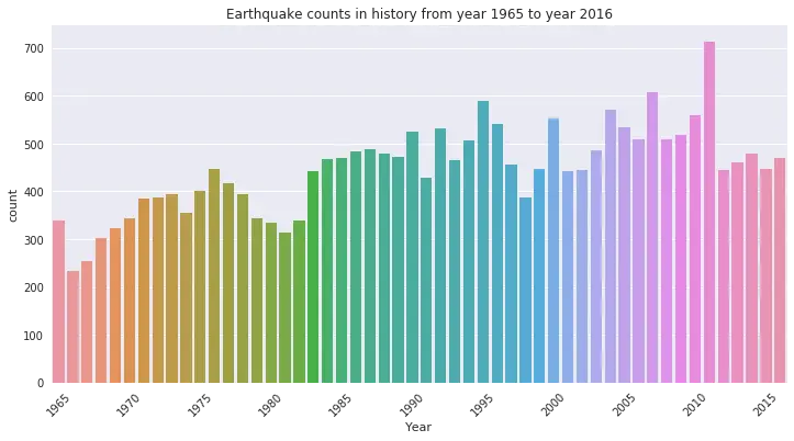 我们可以先用Countplot作图,看一看在1965-2015年间,每年各有多少次地震。