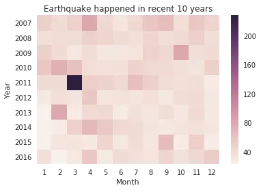 其次,我们可以按年、月份制作热力图(heatmap),观察近十年的地震记录,