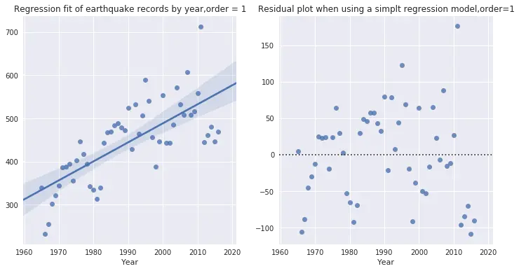 可以对以年为单位的地震记录作线性回归拟合。以下两张图分别对应一阶线性回归拟合、拟合后残值分布情况图。