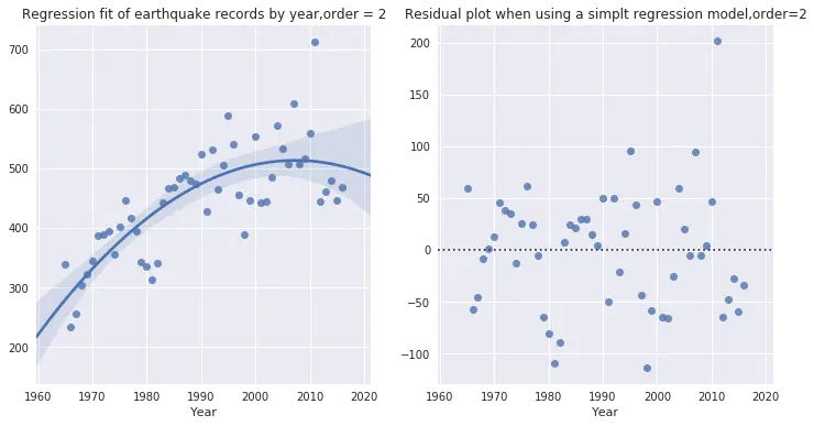 plt.title('Regression fit of earthquake records by year,order = 2')