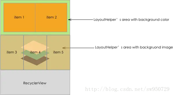 背景颜色或者背景图,这其实不是布局属性,但是由于在vlayout对视图进行了直接布局,不同区域的视图的父节点都是RecyclerView,如果想要针对某一块区域单独绘制背景,就很难做到了。vlayout框架对此做了特殊处理,对于非fix、非float类型的LayoutHelper,支持配置背景色或背景图。同样目前主要针对非fix类型的LayoutHelper实现这个特性。