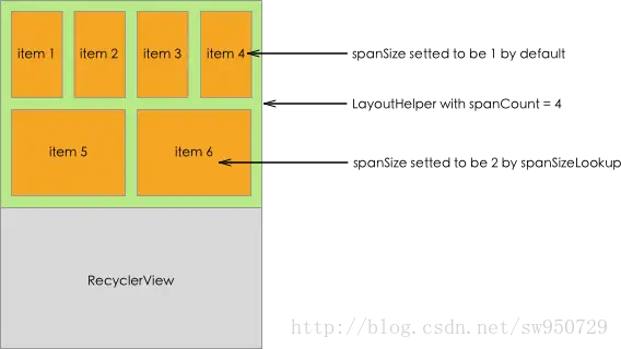 GridLayoutHelper的属性,参考于系统的GridLayoutManager,spanCount表示网格的列数,默认情况下每一个视图都占用一个网格区域,但通过提供自定义的spanSizeLookUp,可以指定某个位置的视图占用多个网格区域。