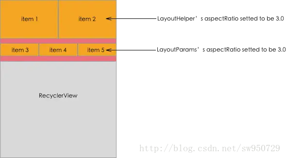 为了保证布局过程中视图的高度一致,我们设计了aspectRatio属性,它是宽与高的比例,LayoutHelper里有aspectRatio属性,通过vlayout添加的视图的LayoutParams也有aspectRatio属性,后者的优先级比前者高,但含义不一样。