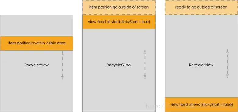 StickyLayoutHelper的属性,当视图的位置在屏幕范围内时,视图会随页面滚动而滚动;当视图的位置滑出屏幕时,StickyLayoutHelper会将视图固定在顶部(stickyStart = true)或者底部(stickyStart = false),固定的位置支持设置偏移量offset。