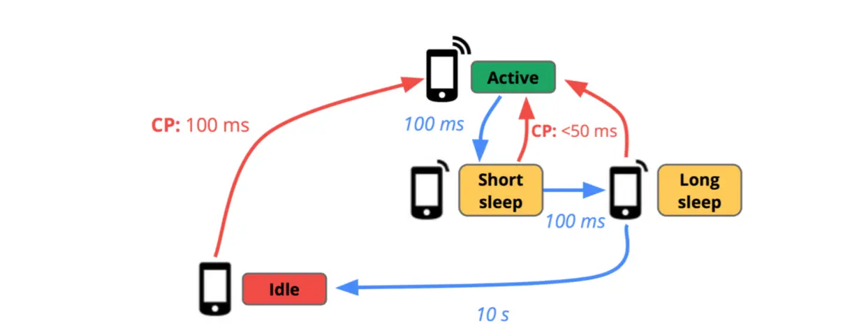 由于不是通信相关领域的开发人员,只阐述个大概意思,RRC 状态机的细节可以参考这里。RRC 会有相关的状态,我们可以简单的理解为空闲状态和活跃状态,在手机待机的时候就可以看成是在空闲状态,在这个状态会关闭无线信号,当需要数据传输的时候再调整 RRC 的状态为活跃,状态的切换过程需要一定的延迟,这个延迟是我们移动网络数据传输延迟的一部分,是用户可以感知(这个延迟整体分为 RRC 状态切换、DNS 解析、TCP 握手、 SSL 握手、网络传输等)。下图来源于网络,可以一定程度上辅助理解(数据不一定准确)。