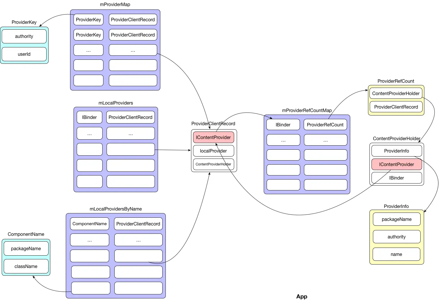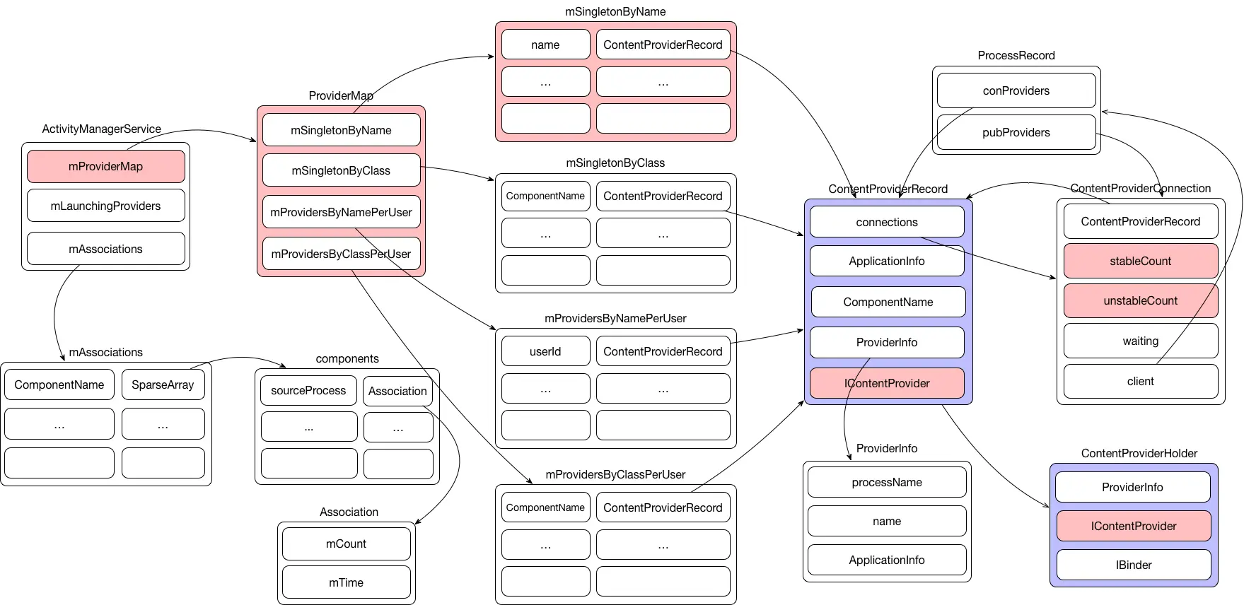 - ProviderMap: AMS端用来缓存ContentProviderRecord的对象,提供四种不同的查询方式