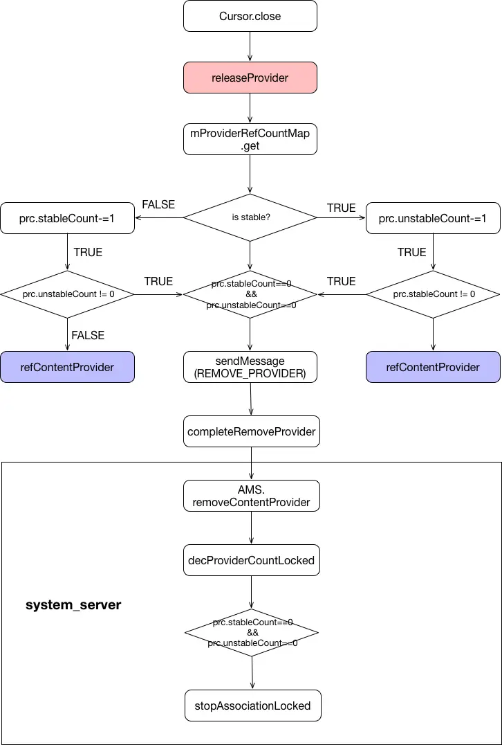 }以上,除了query外,其它操作都会在最后调用releaseProvider释放provider的计数;query比较特殊,会在调用cursor的close后才调用;