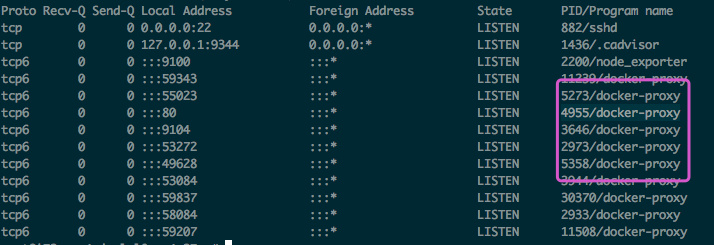 原先的docker,一般run一个容器加入-p参数,就可以看到端口。 这其实是由当前tcp/ip栈内的docker-proxy开放的,如图: