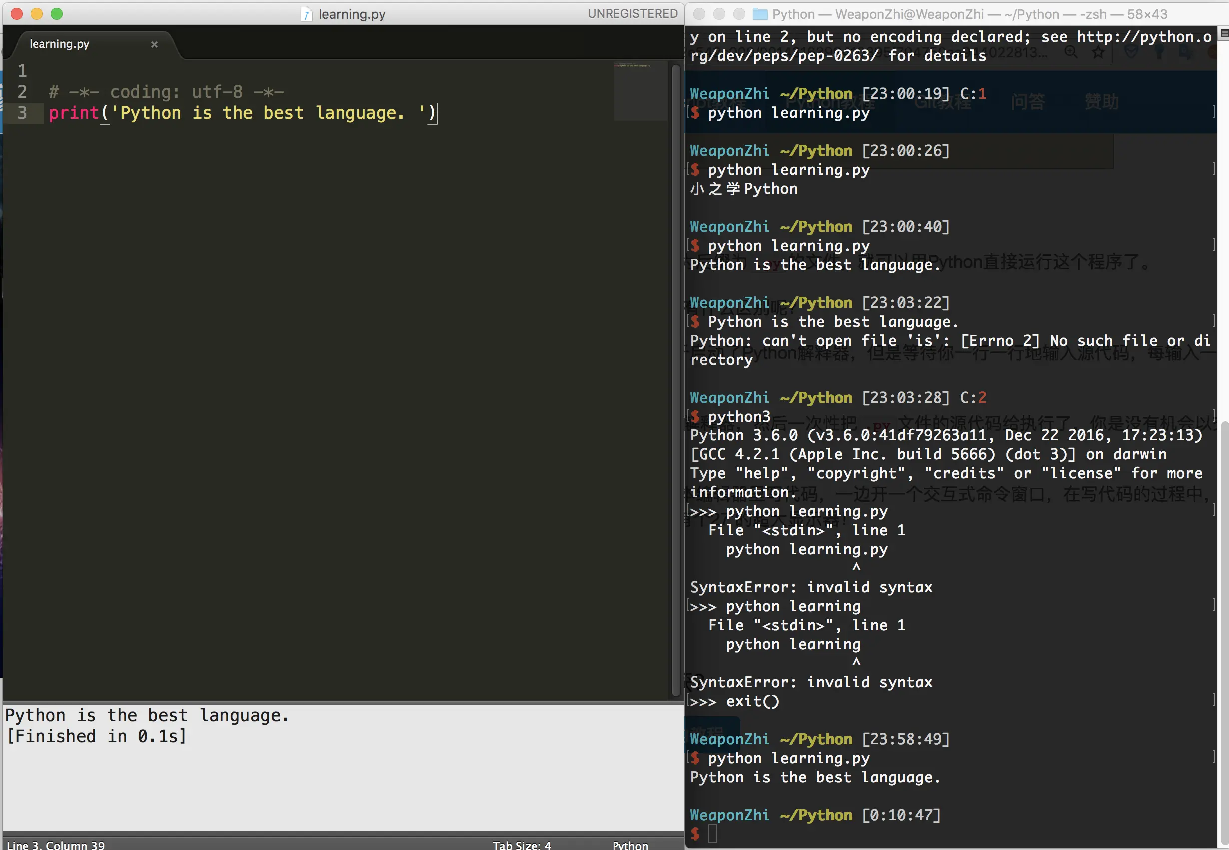 这里推荐大家使用「Sublime Text」配合交互式环境来进行学习,在 Sublime Text 中进行代码编写,在 Tools --> Build System 中选择 Python 后,通过「Command+B」(Mac) 来编译,如果有需要验证某一行代码,就复制到交互式环境中去验证,使用这种方式来学习 Python 语法,别提有多来劲了。