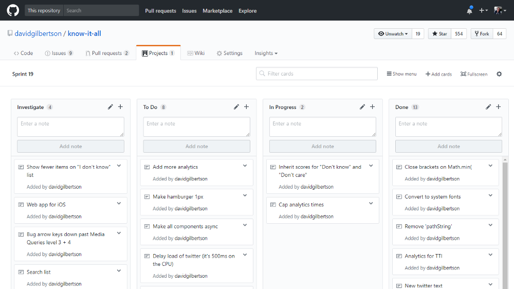 你可以点击右上角 Add Cards 来添加东西。这里有些特殊语法方便搜索,比如: is:pr is:open,你就可以把任何公开的 PR 拖到 board 上。