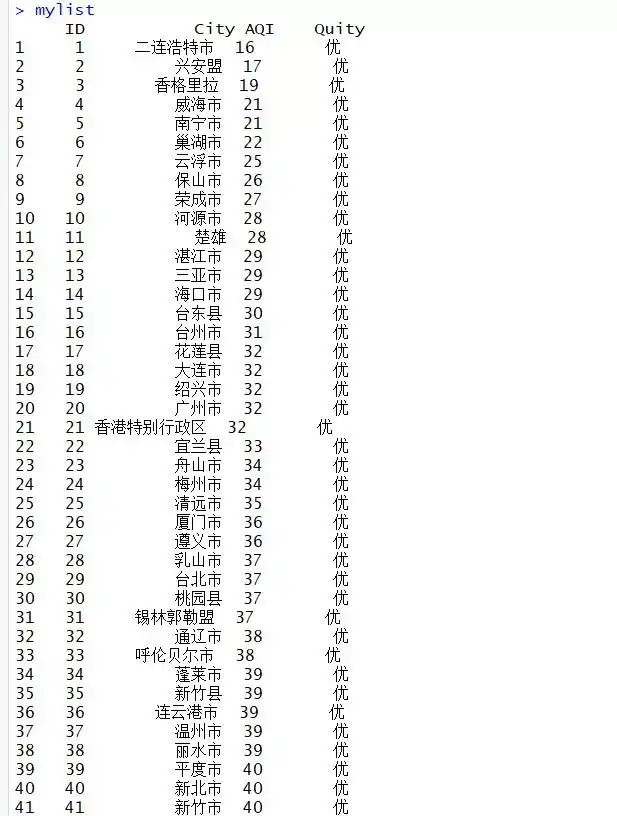使用str_extract()函数提取城市id、城市名称、城市污染物指数、污染状况。