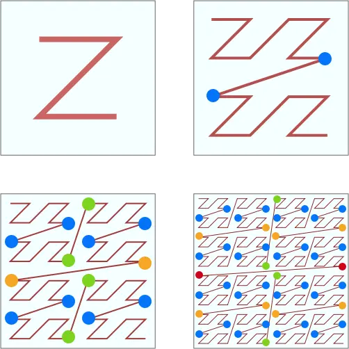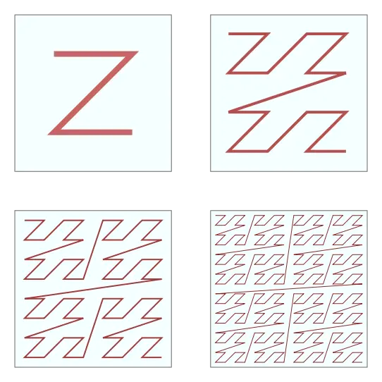 上图就是 Z 阶曲线。这个曲线比较简单,生成它也比较容易,只需要把每个 Z 首尾相连即可。