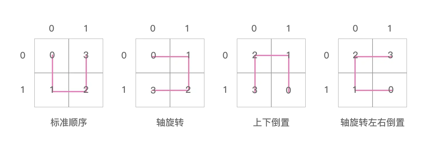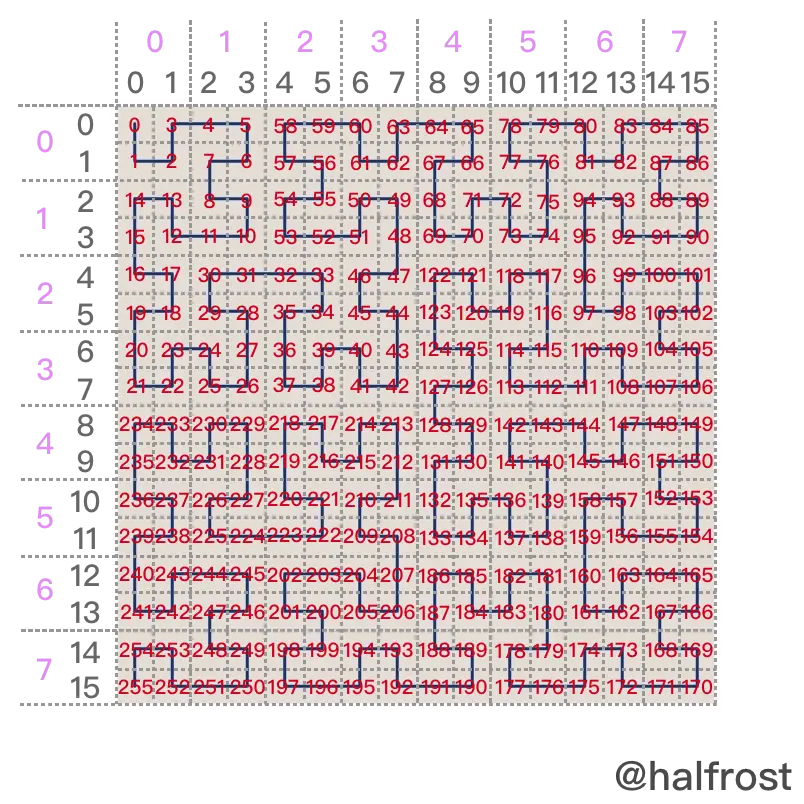 接下来解释之前说的 Geohash 和 Z 阶曲线的关系。回顾最后一步合并经纬度字符串的规则,“偶数位放经度,奇数位放纬度”。读者一定有点好奇,这个规则哪里来的?凭空瞎想的?其实并不是,这个规则就是 Z 阶曲线。看下图: