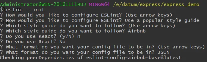 根据自己的项目需求配置,我这里选择的标准是Airbnb标准。在use arrow keys的时候,有些是看不到箭头的移动,但是已经选择了,所以选择哪呢,就按上下键+enter就好,反正我的是看不见,也能选上。