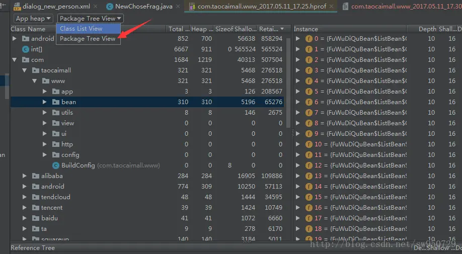 我们可以更仔细的查找泄漏的位置,在AS里面使用 Heap SnapShot工具(堆栈快照)。如图所示:我们点击后,他会进行一段时间的监控,然后会生成一个文件。我们点击我们package tree view。