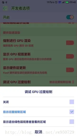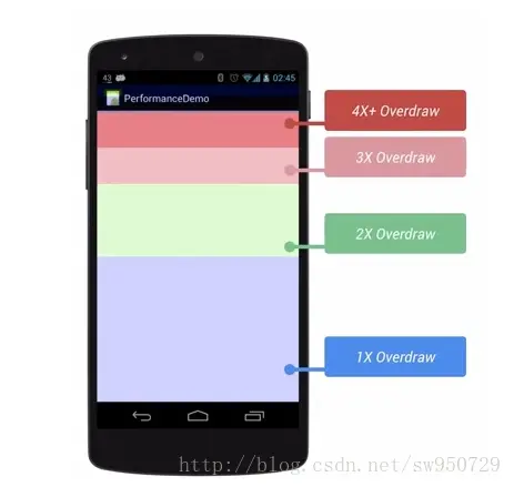 View过度绘制,导致某些像素在同一帧时间内被绘制多次,从而使CPU或GPU负载过重;