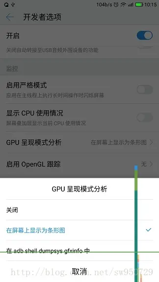 我们依旧打开设置-->开发者选项-->GPU呈现模式分析-->在屏幕上显示为条形图,如图所示: