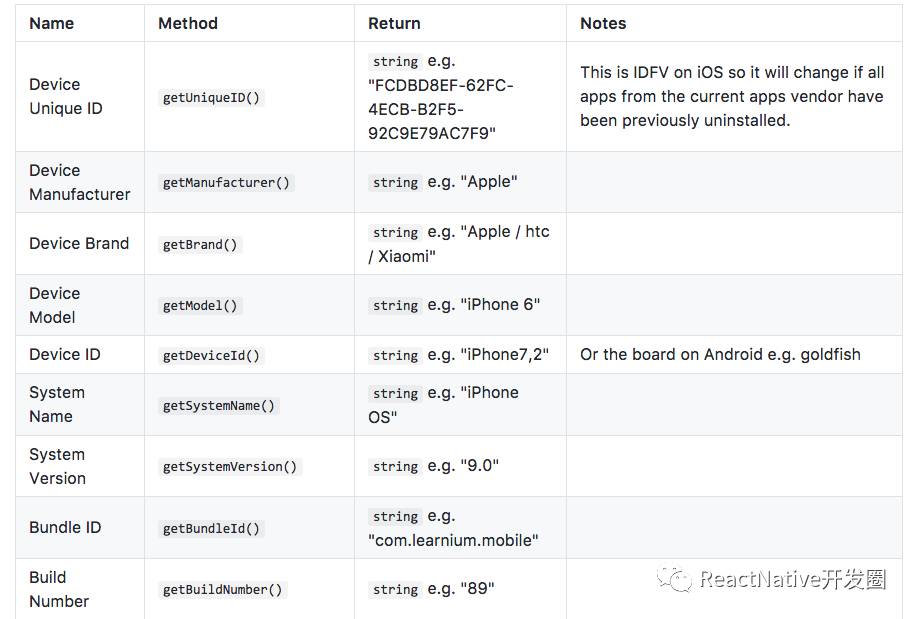 这次介绍的获取移动设备信息的组件名叫:react-native-device-info,兼容IOS和安卓双平台,可以获取设备ID、设备品牌、设备型号、IP以及APP版本号等信息。是一个应用很广泛的基础组件。