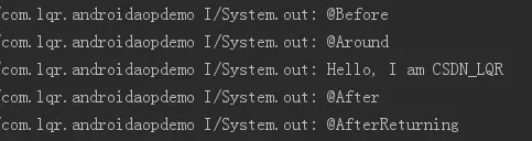匹配com.lqr包下所有返回类型是int的方法,在方法返回结果之后打印"CSDN_LQR"。