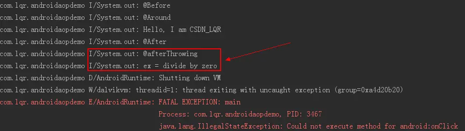 匹配com.lqr包及其子包中的所有方法,当方法抛出异常时,打印"ex = 报错信息"。