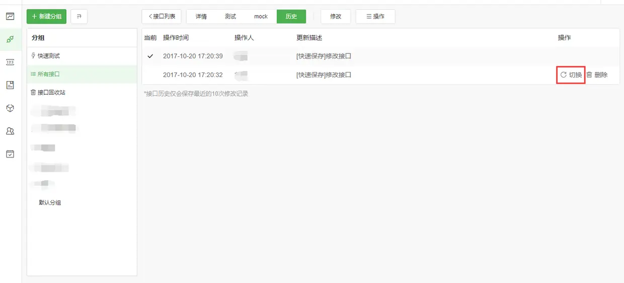 类似gitHub,接口文档的每一次改动历史应清晰记录下来。在后期接口管理和维护上,我只要通过对操作历史的查看,就可以了解到每次改动的目的和内容,进而更加方便管理接口。目前发现可以记录了接口文档近十次的操作历史,也支持接口历史一键回溯功能,算是一定程度上降低了成员对接口文档误操作的风险。