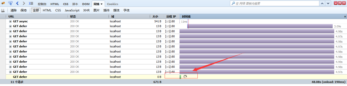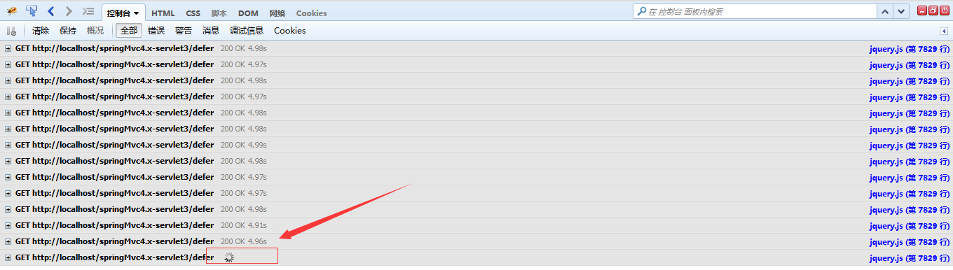 访问http://localhost/springMvc4.x-servlet3/async,可以看到网络不断的在获取服务器端推送的消息,如下图所示: