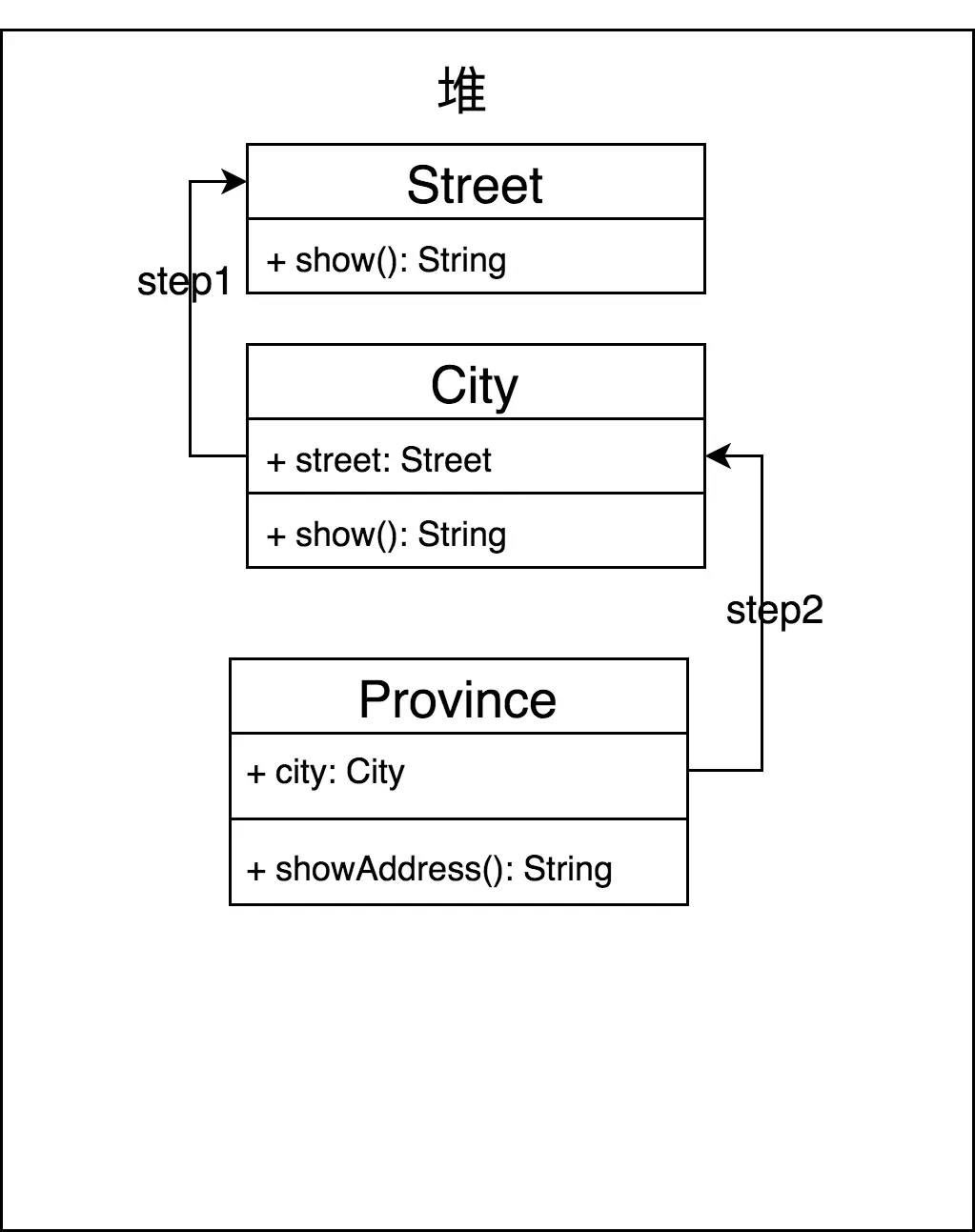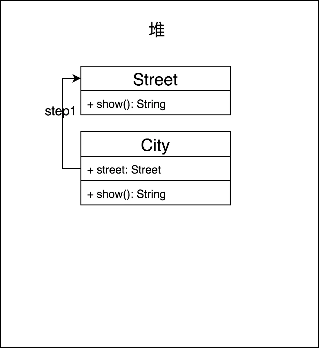 可以看到在整个过程中Street其实new了4次,如果依赖更多的话(比如最外层再加个Country),Street在内存中被new的次数也会*2,不过过程中这些对象最终都会变成垃圾被回收(总觉得这是额外的开销,依赖多了岂不是编译就慢了?),而不用dagger2只要new一次就可以了(如下图),但是两者最终都是一条依赖链